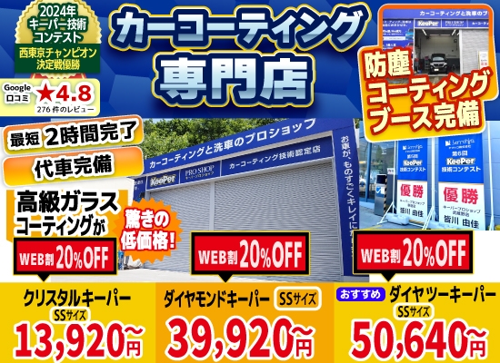 当HPをご覧になったお客様限定で、コーティングの施工料金を最大20%割引で実施中!また、他社にはないお得な特典もお客様にご提供しております。キーパーコーティングをお考えのお客様は、是非、当店にお任せください!