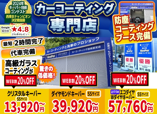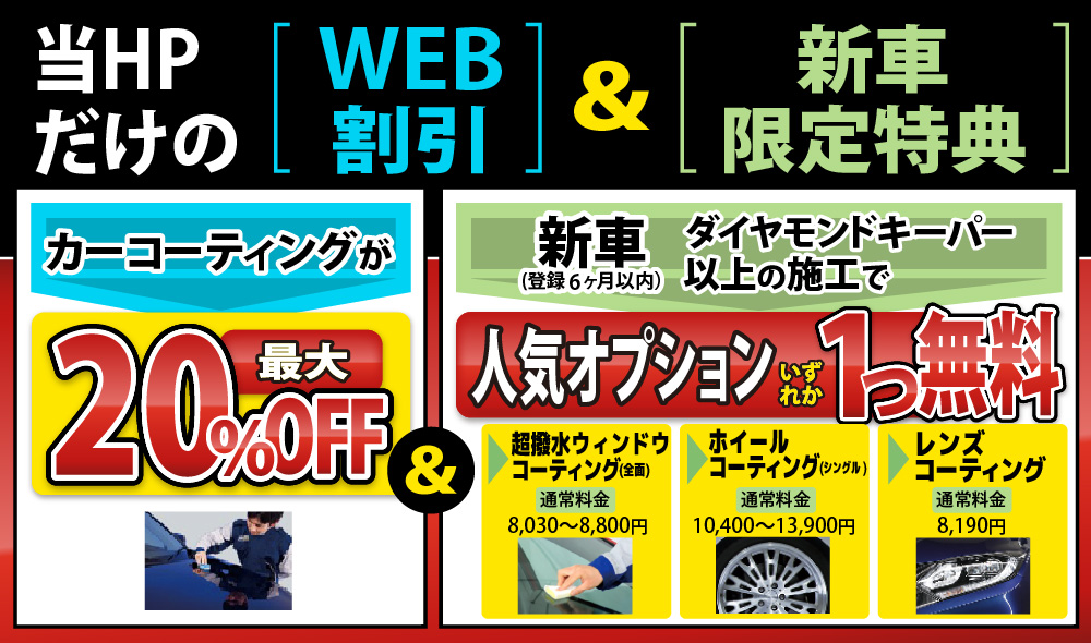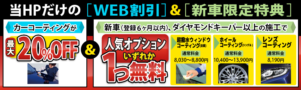 当HPをご覧になったお客様限定で、コーティングの施工料金を最大20%割引で実施中!また、他社にはないお得な特典もお客様にご提供しております。キーパーコーティングをお考えのお客様は、是非、当店にお任せください!