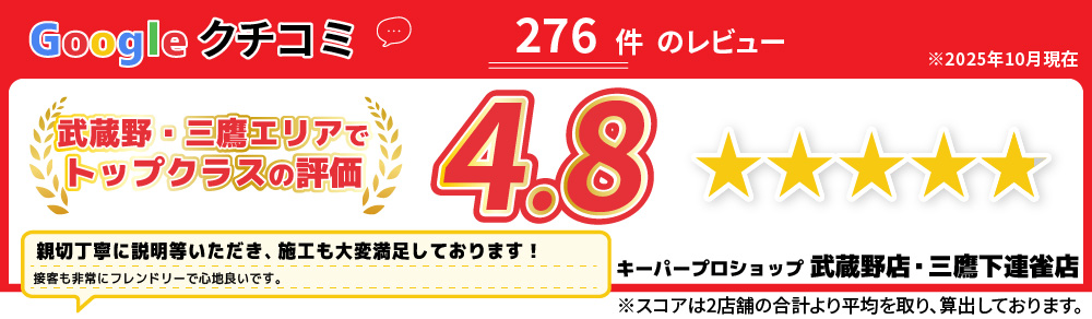 武蔵野店には、キーパーコーティング技術1級資格者5名、三鷹下連雀店にはキーパーコーティング技術1級資格者4名が在席しております。